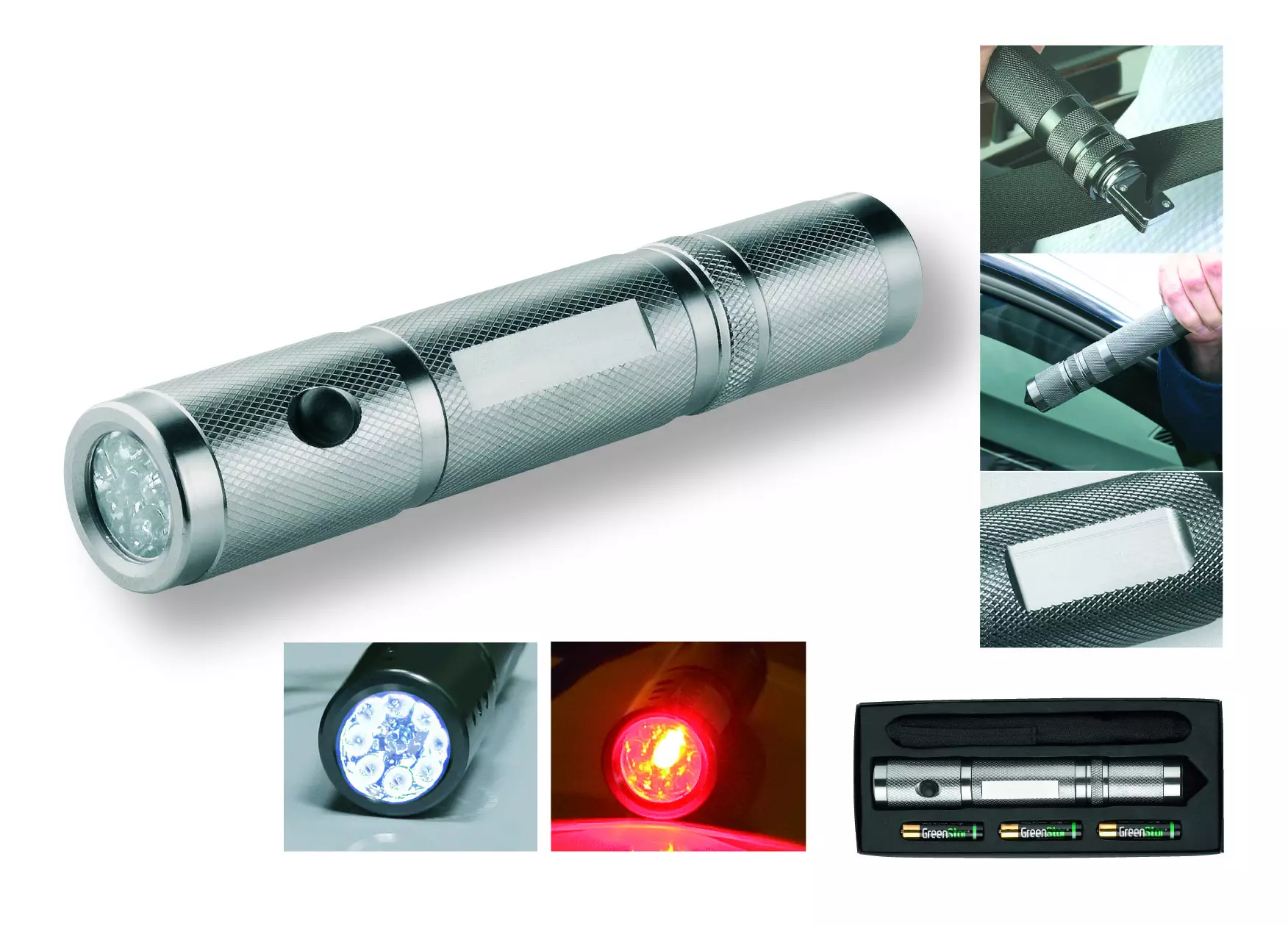 9 LEDillä: 8 valkoista ja 1 punainen, erikseen kytkettävät varoitus LEDit turvallisuutenne takia. Turvavyön leikkuri, ikkunansärkijä, 3 UM4/AAA -paristoa. Väri hopea
